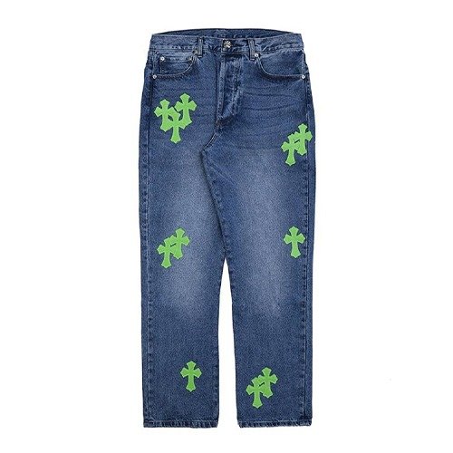 - Design: Blue jeans featuring distinctive green cross graphics