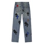 - Design: Blue jeans with a bold array of multi-colored cross graphics
